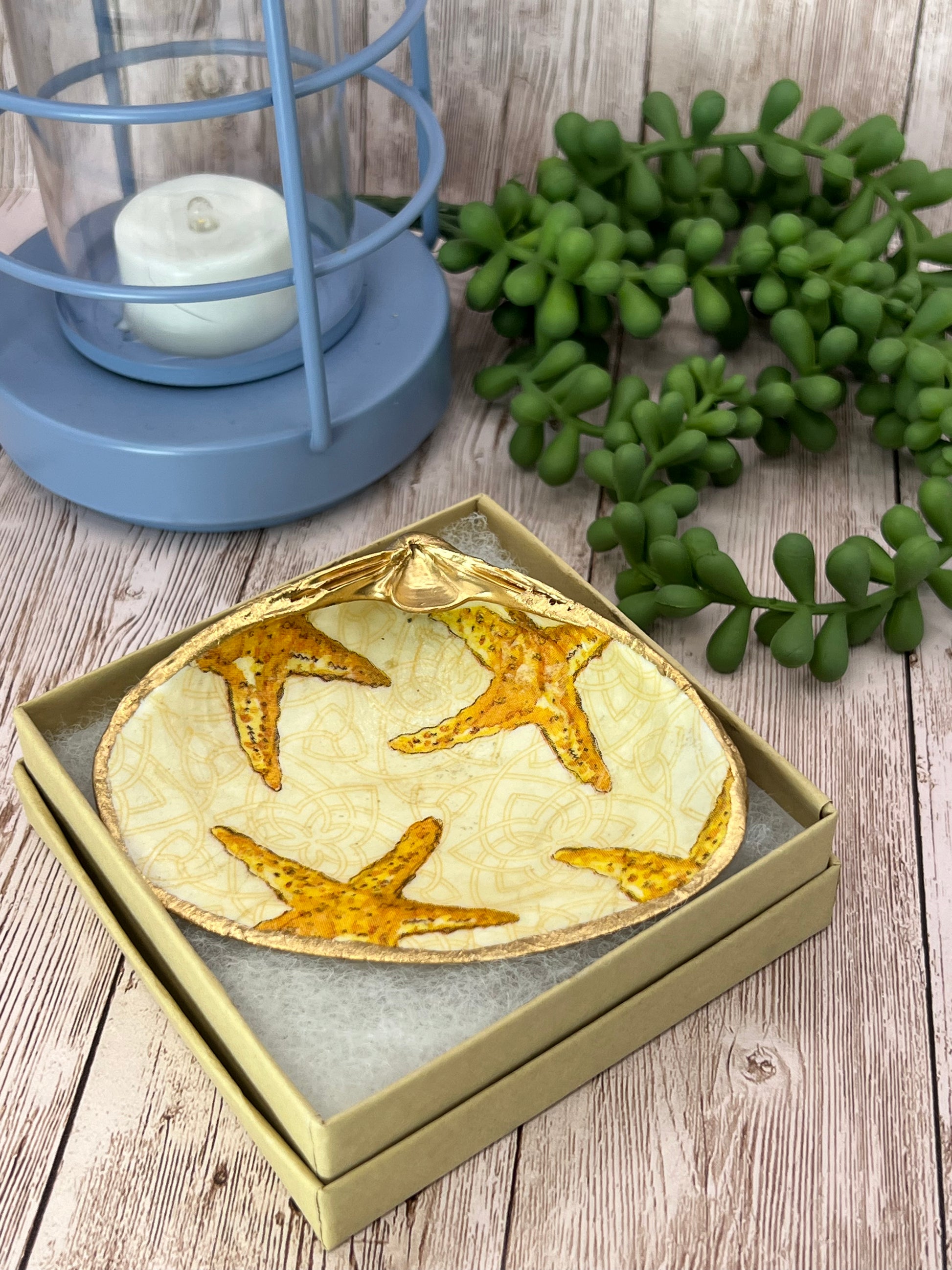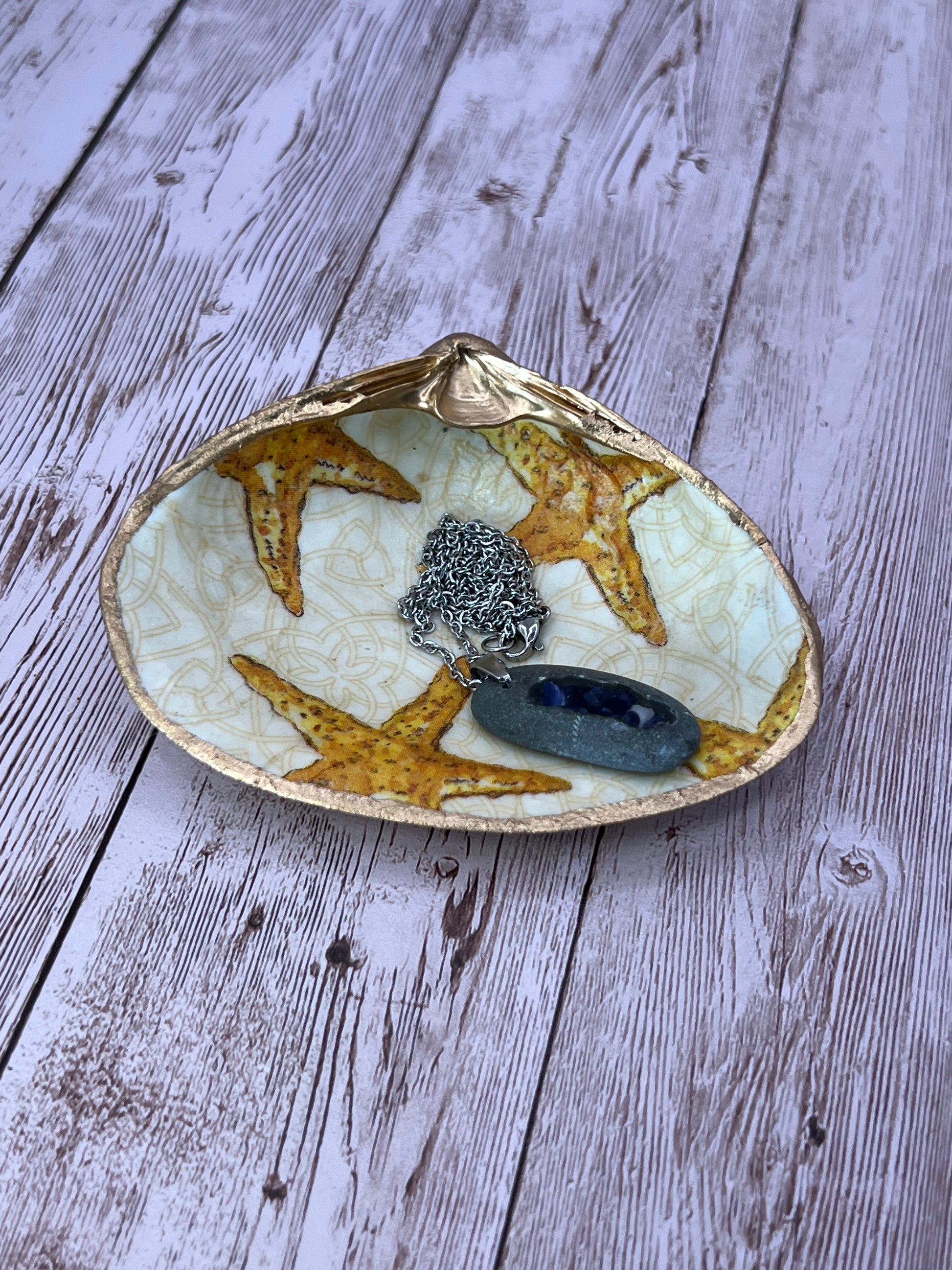 This elegant ring dish is crafted from a genuine clam shell, sourced from the picturesque beaches of Maine. Handmade with care, the face side is beautifully decoupaged with a water-resistant adhesive, ensuring a lasting design, while the backside is finished with liquid 14k gold for a touch of sophistication.