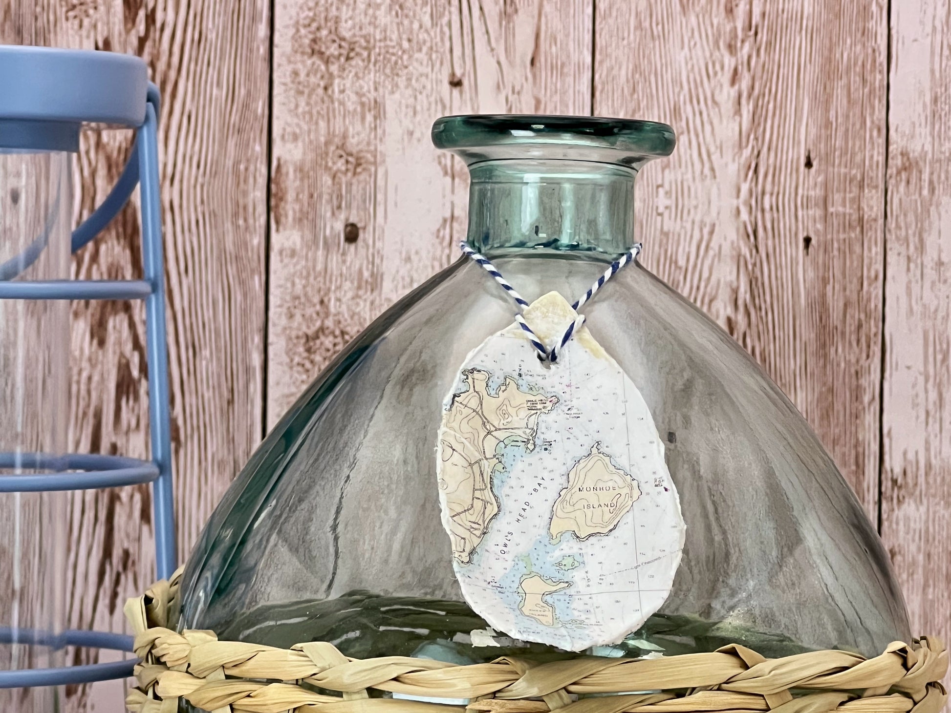 Add a piece of Maine’s coastline to your home with this beautifully decoupaged scallop shell, featuring the timeless elegance of an Owls Head nautical map.