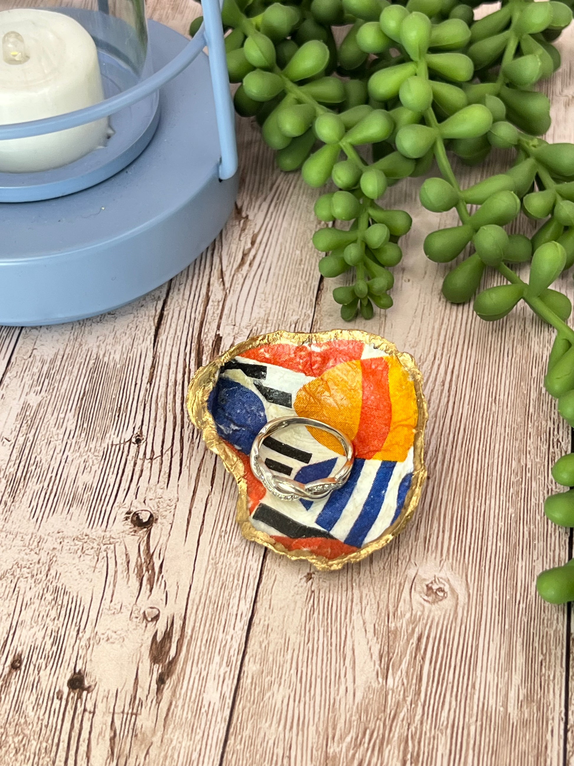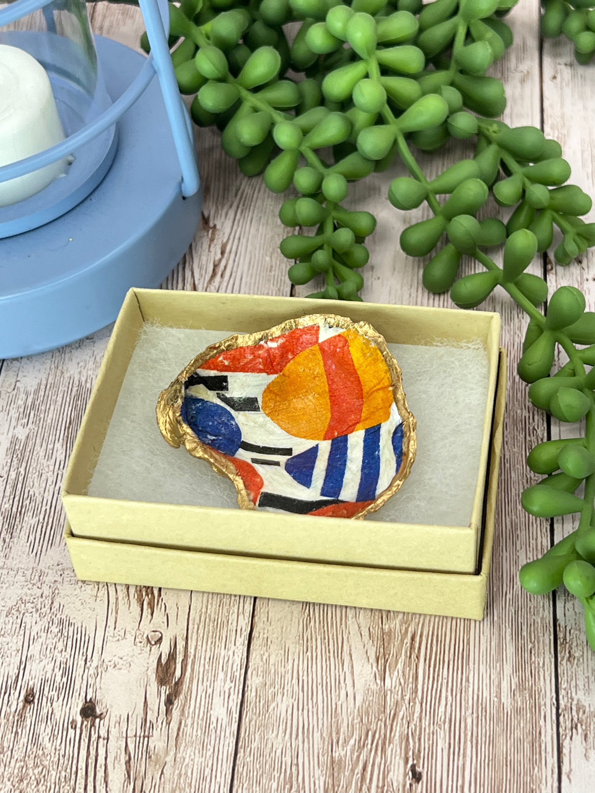 Ring dish made from an oyster shell sourced from a Maine beach. Handmade in Maine, decoupage with a water resistant adhesive on the face side and liquid 14k gold on the backside. Comes in a 3” x 2” gift box.