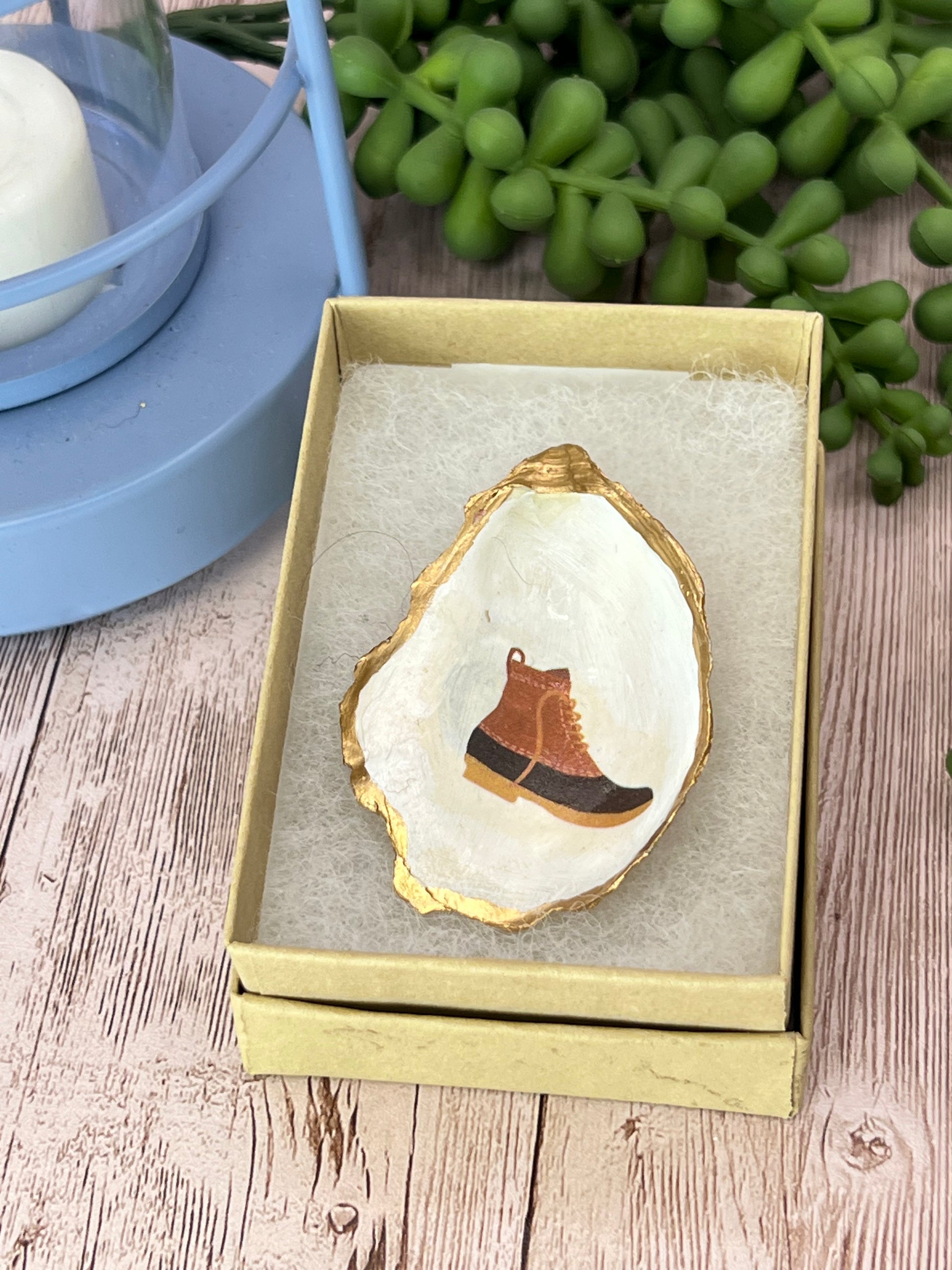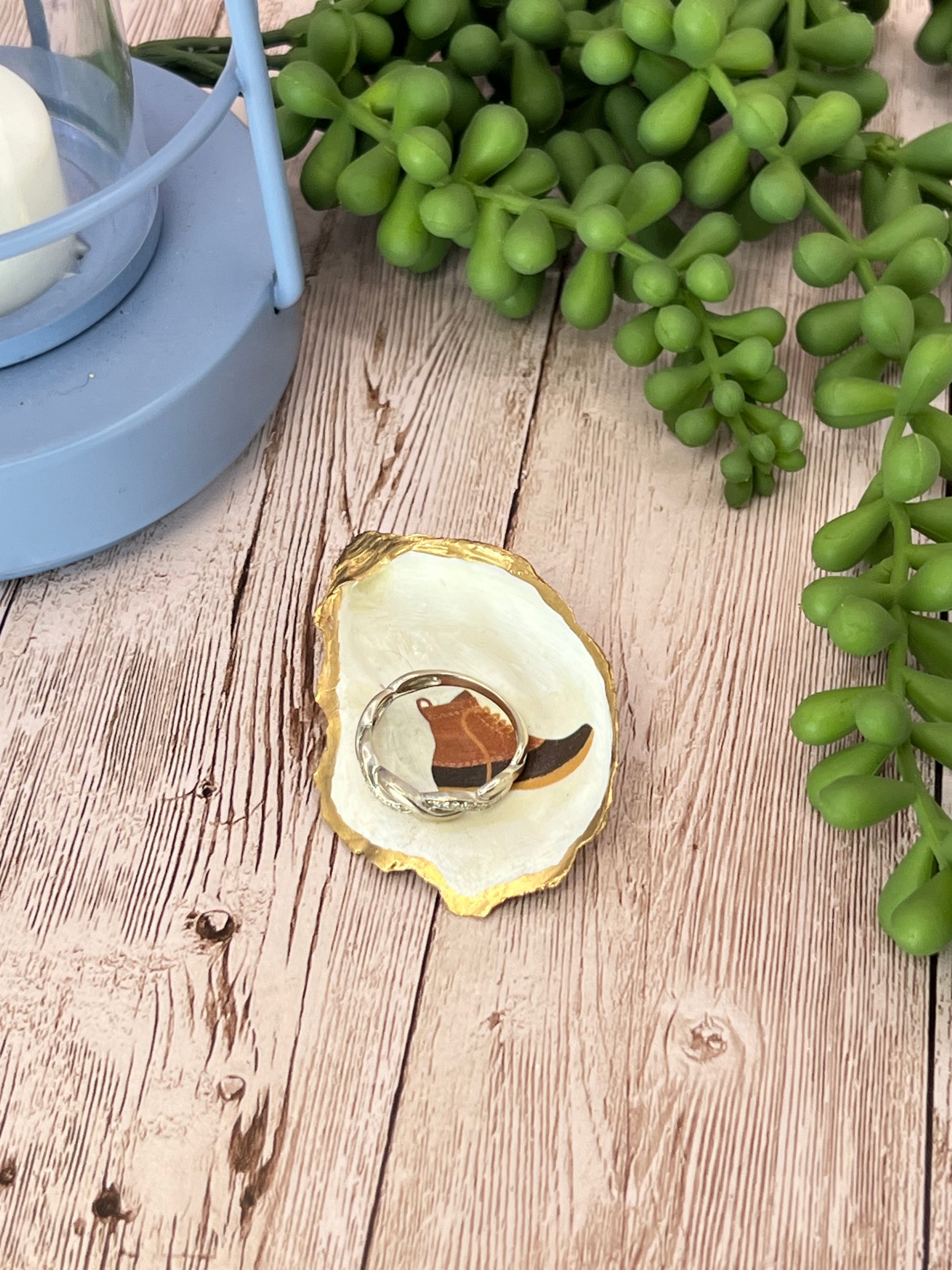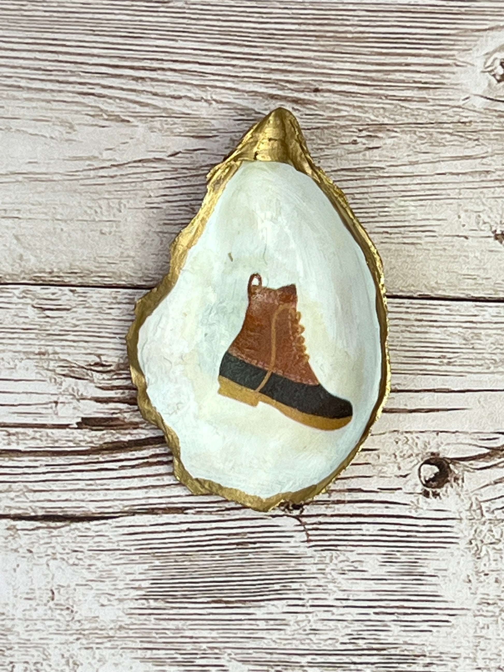Ring dish made from an oyster shell sourced from a Maine beach. Handmade in Maine, decoupage with a water resistant adhesive on the face side and liquid 14k gold on the backside. Comes in a 3” x 2” gift box.
