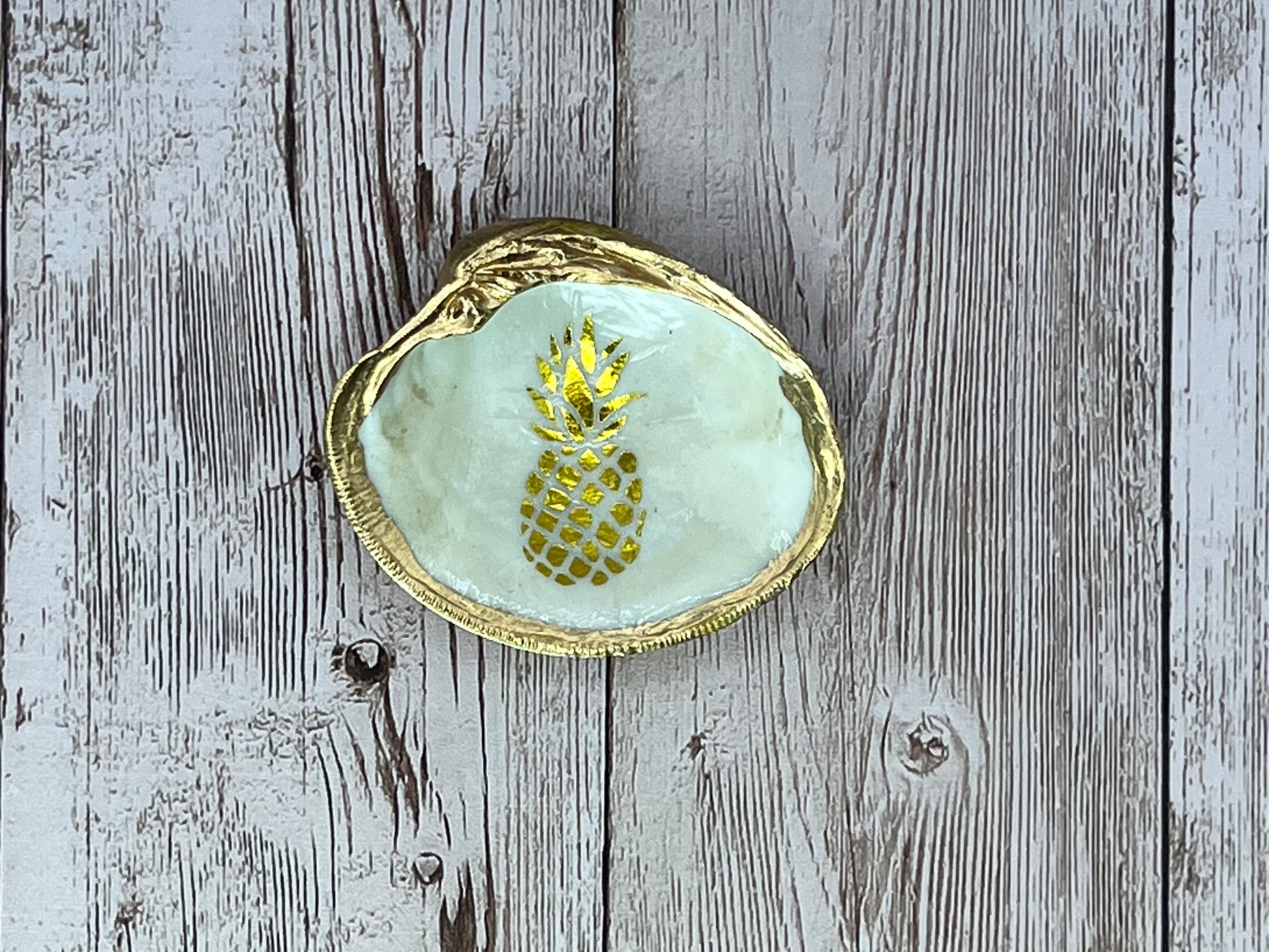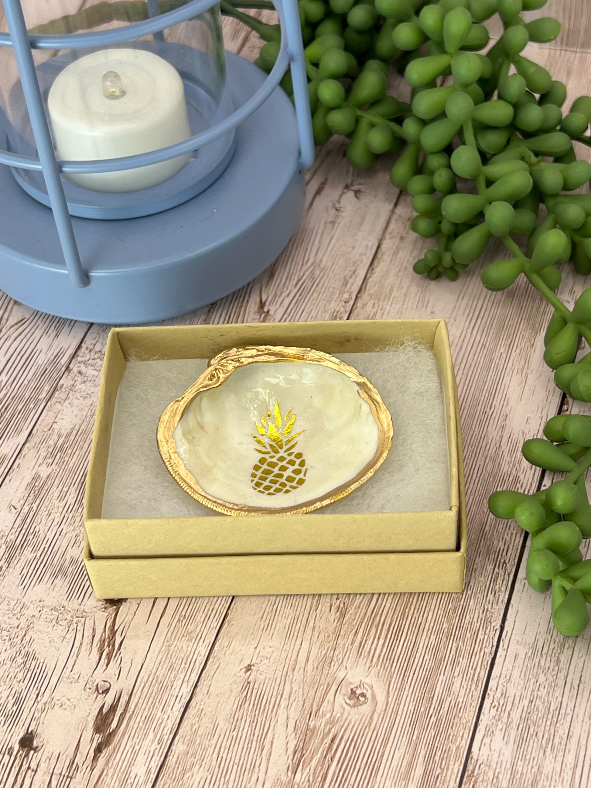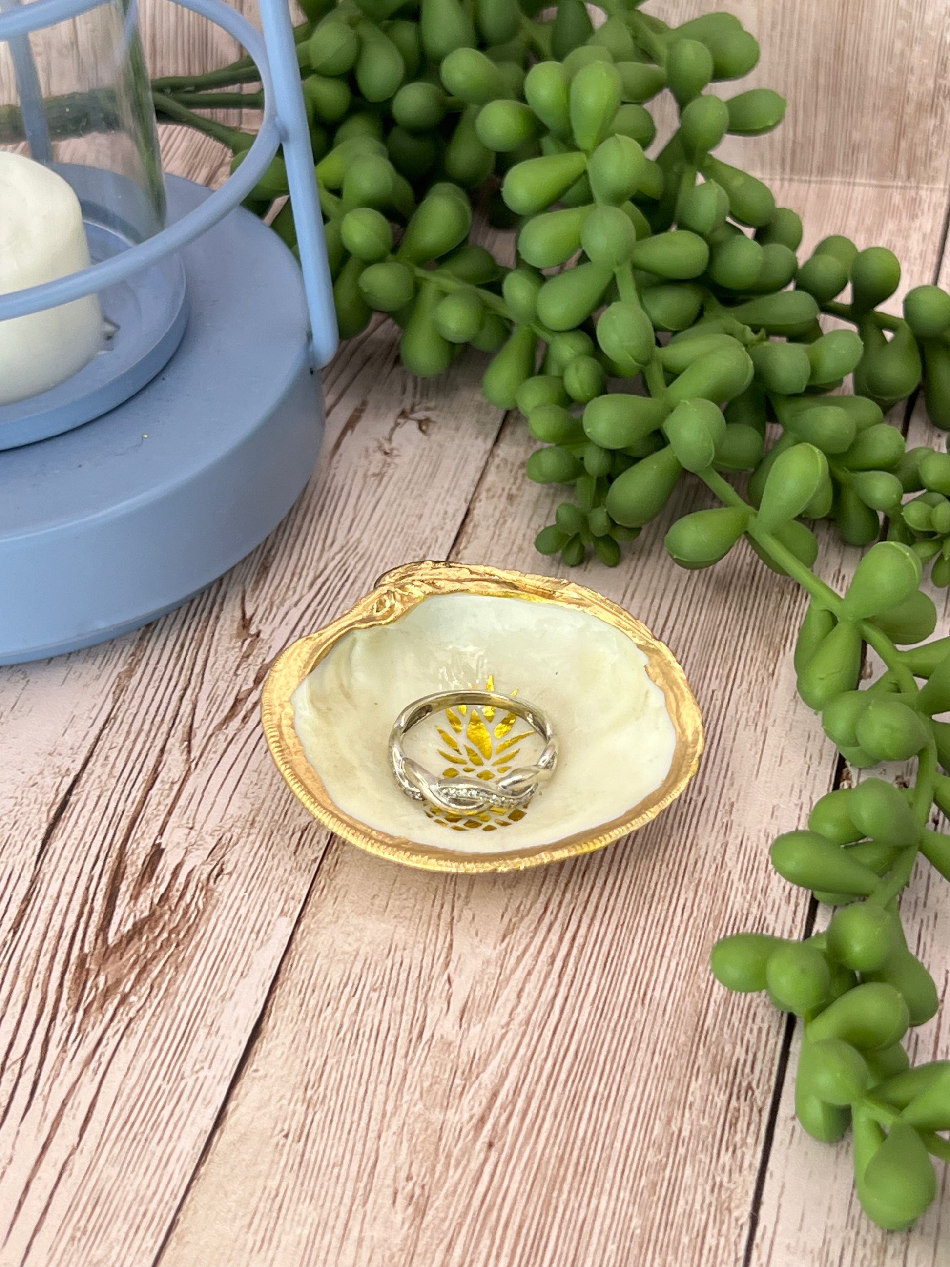 Ring dish made from a clam shell sourced from a Maine beach. Handmade in Maine, decoupage with a water resistant adhesive on the face side and liquid 14k gold on the backside. Comes in a 3” x 2” gift box.