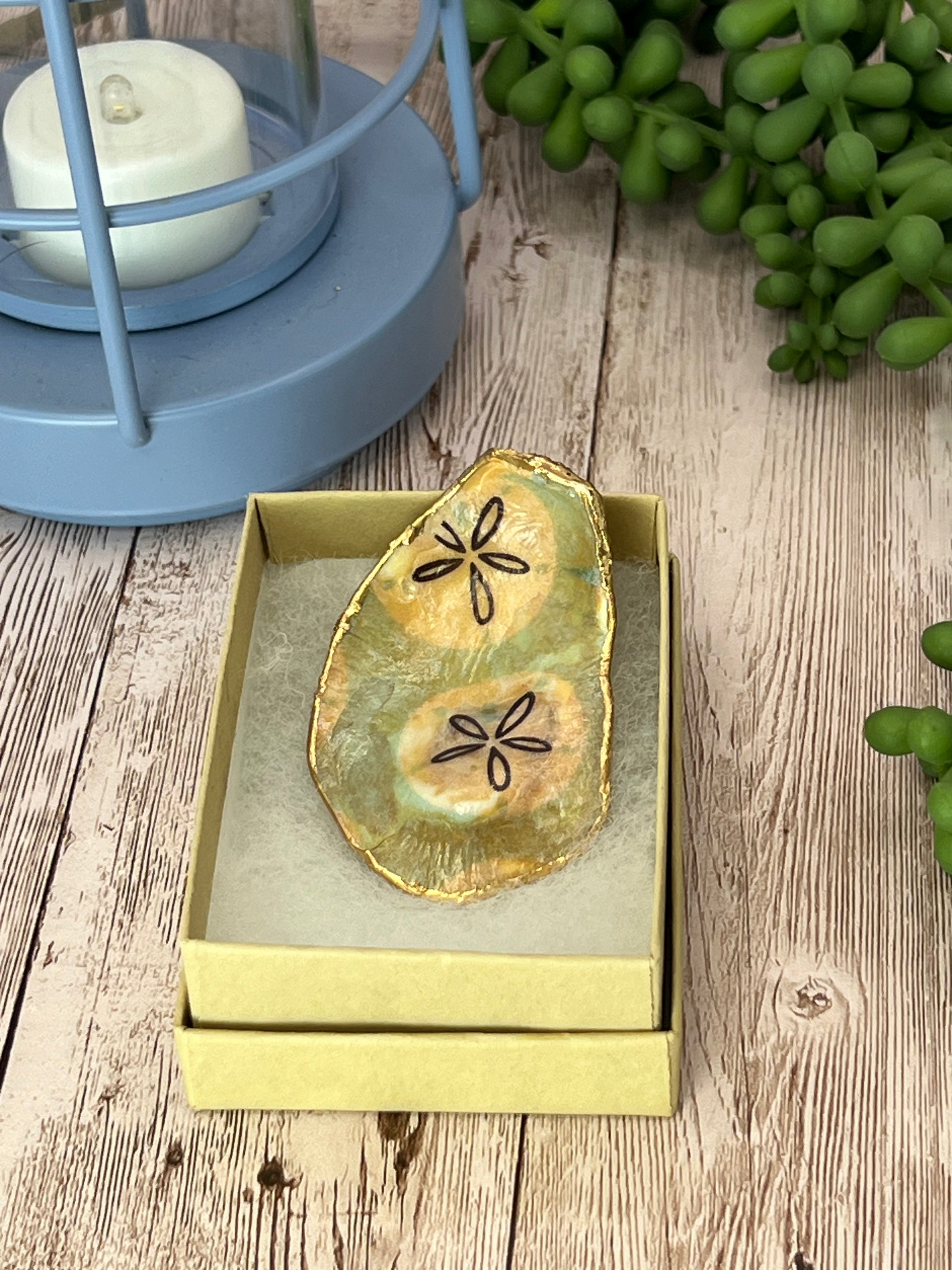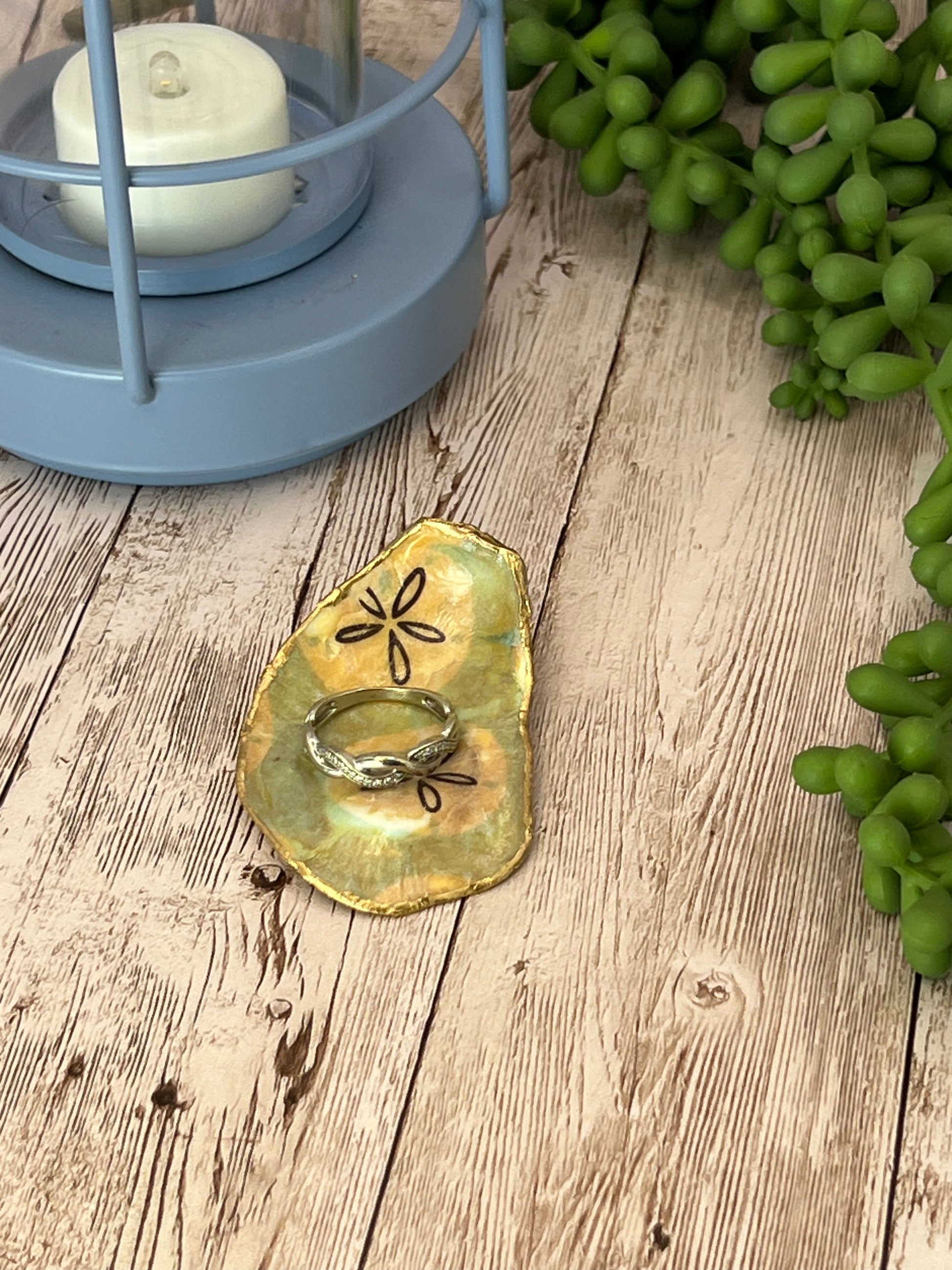 Ring dish made from an oyster shell sourced from a Maine beach. Handmade in Maine, decoupage with a water resistant adhesive on the face side and liquid 14k gold on the backside. Comes in a 3” x 2” gift box.