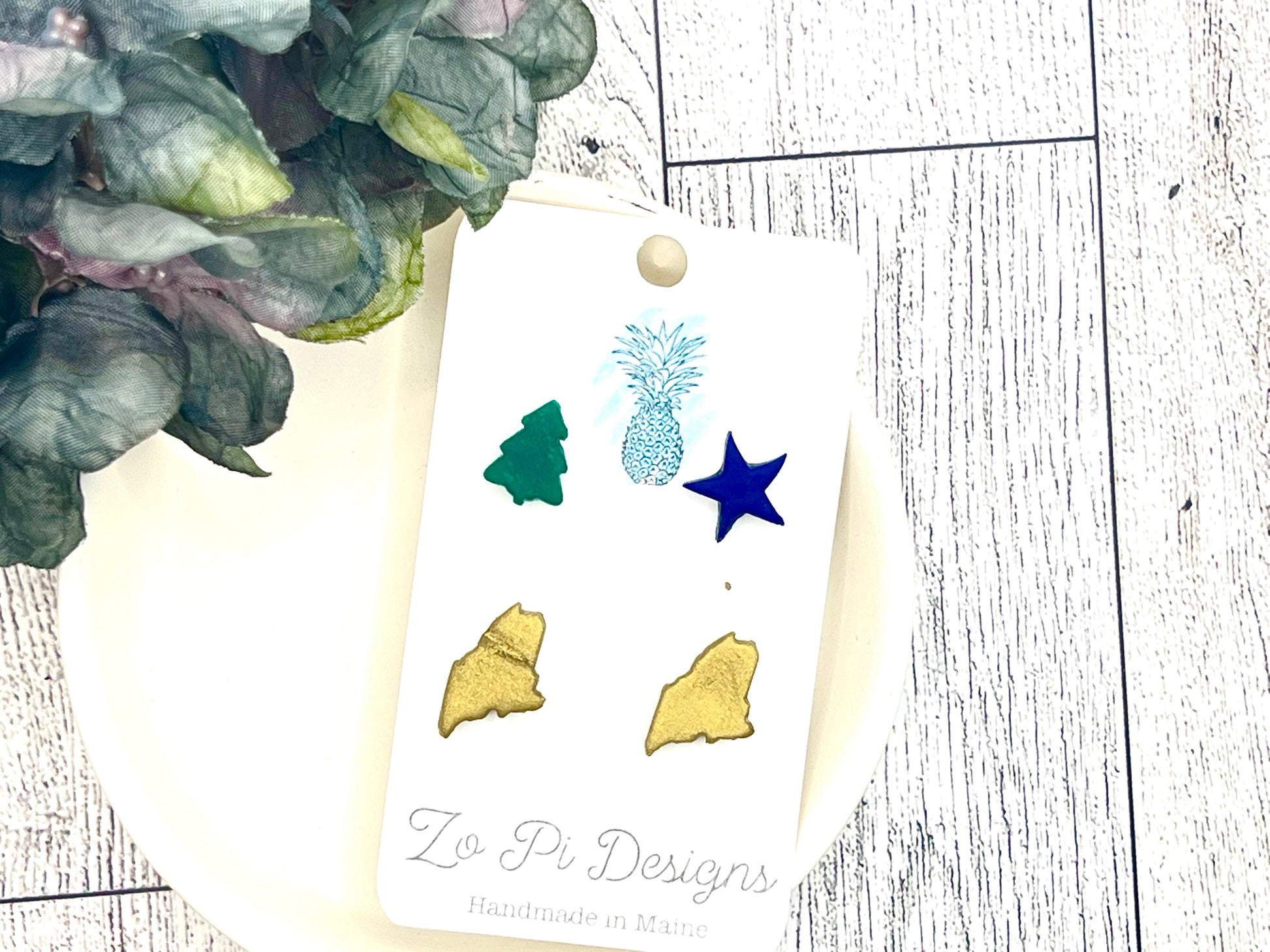 Bold, Maine-inspired designs, crafted to make a statement. These two sets of studs offer a stylish and modern take on Maine-inspired design. One set features an outline of the state of Maine, capturing its iconic shape with sleek simplicity, while the other set showcases a deconstructed version of the 1920s Maine state flag, reimagined in a minimalist, artistic form. Both sets are expertly crafted from durable polymer clay, with stainless steel posts for a comfortable and secure fit. Whether you’re showcasing your Maine pride or adding a touch of vintage flair, these earrings are the perfect accessory for any occasion.