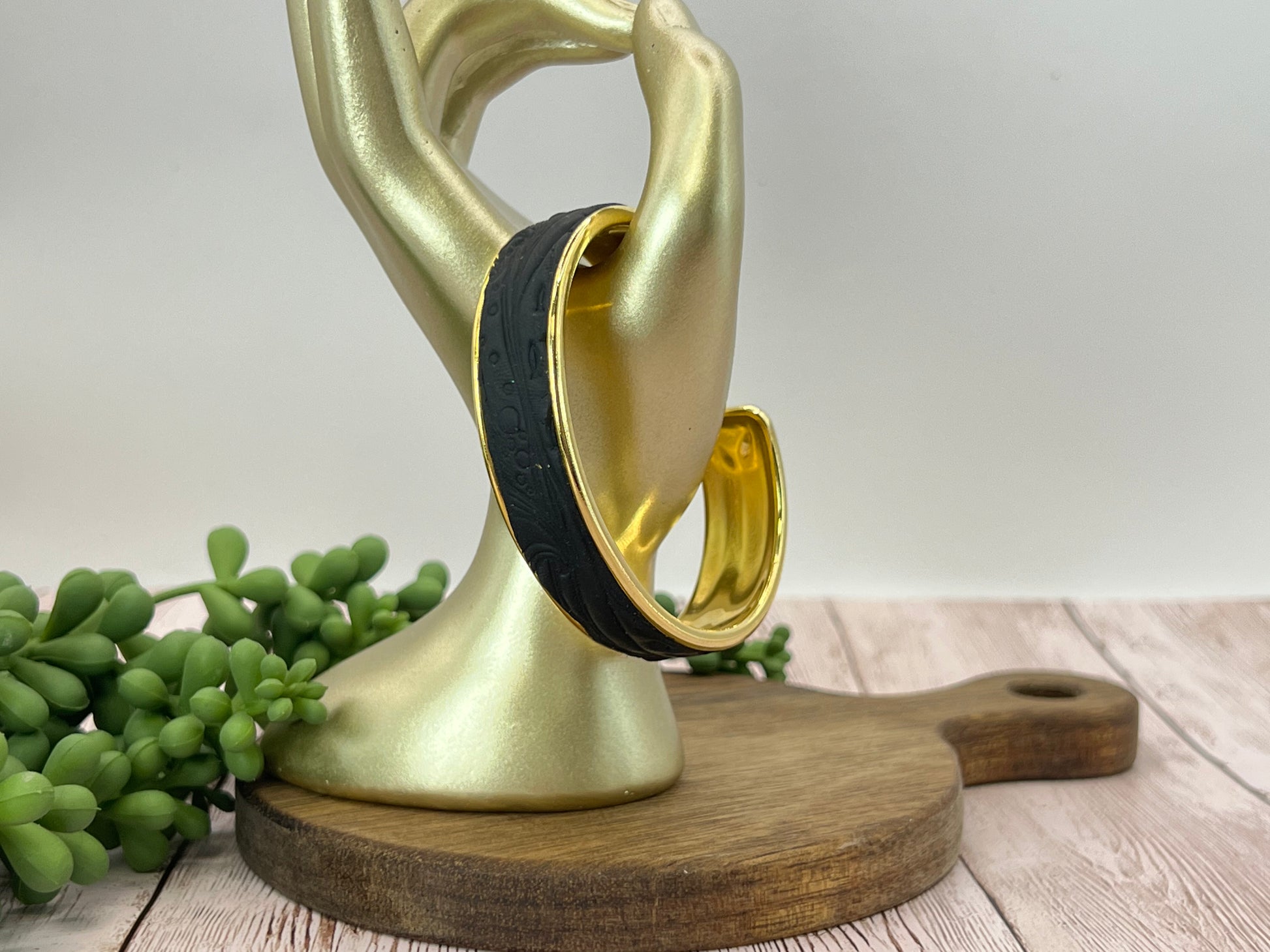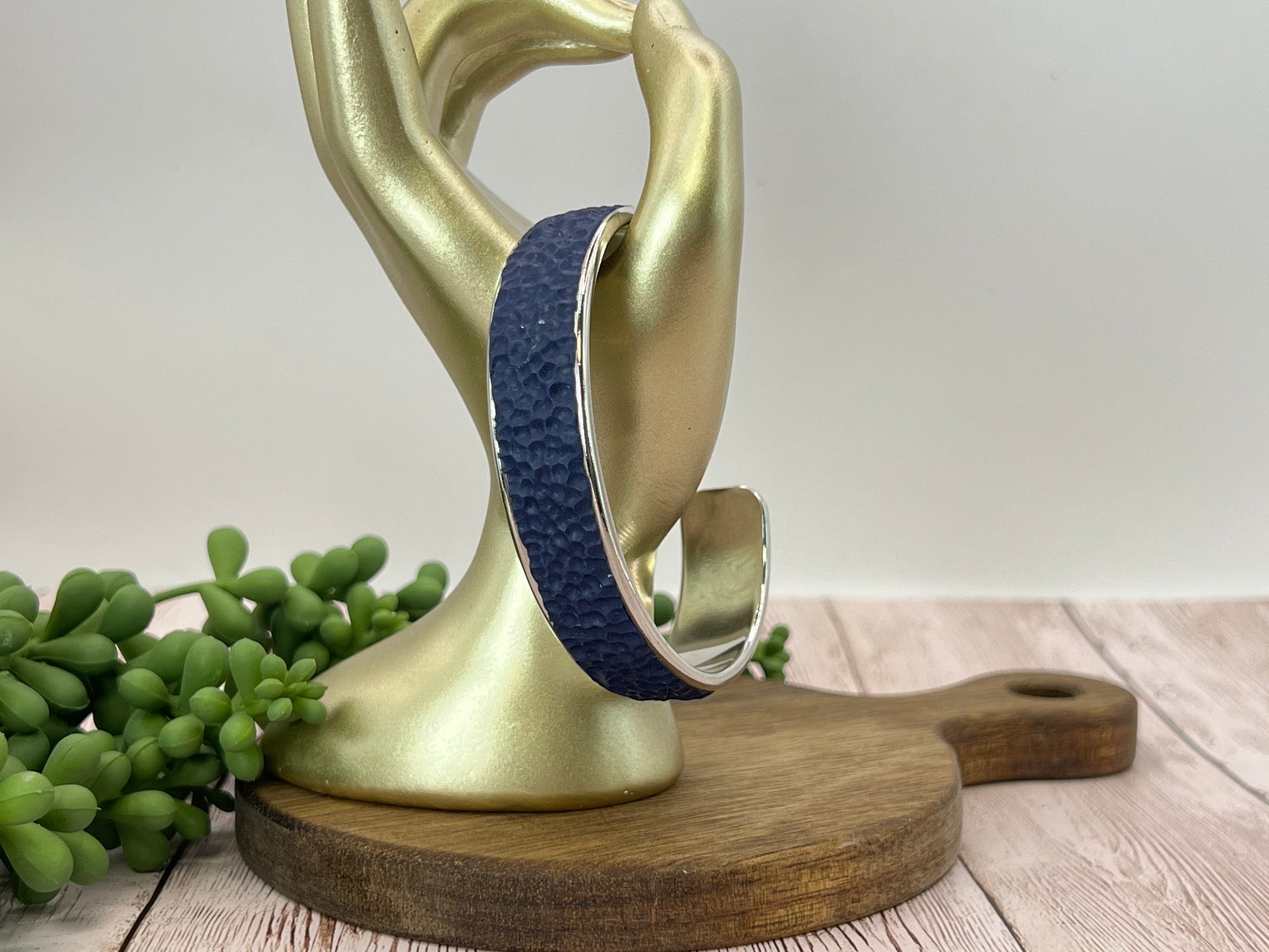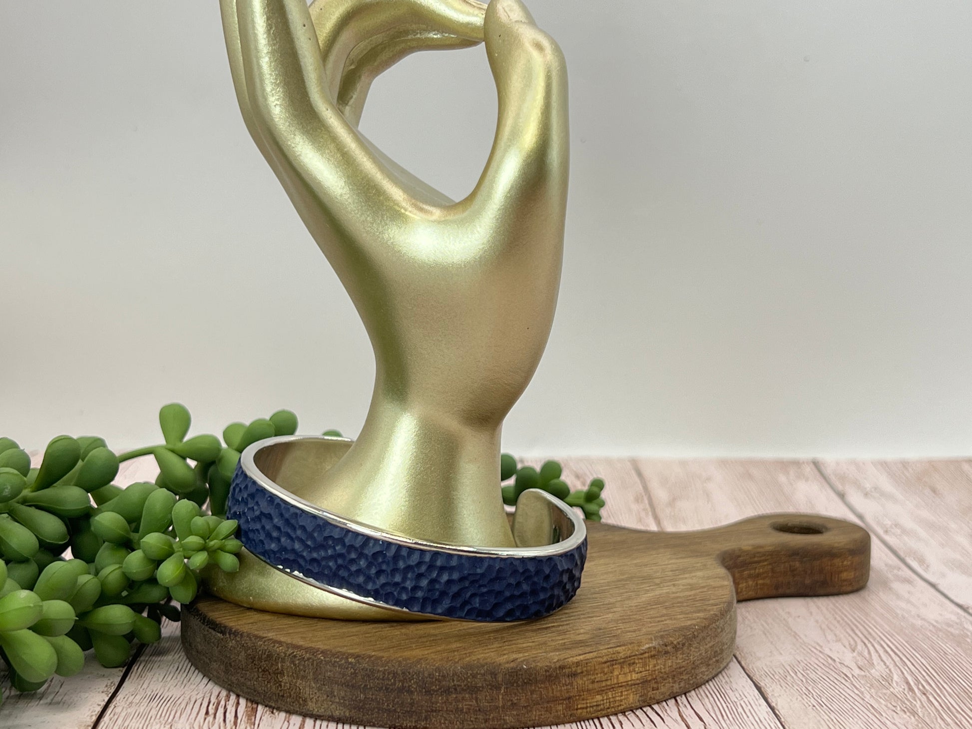 These open metal bangles feature beautifully textured polymer clay embedded within the frame, creating a stunning contrast between the smooth metal and the intricate, tactile clay design. The polymer clay, molded and crafted with careful attention to detail, adds a pop of color and a sense of artistic depth to the otherwise sleek and minimalistic metal bangle. The unique texture of the clay enhances the overall aesthetic, giving each bangle a one-of-a-kind look. Perfect for adding a touch of handcrafted elegance and modern flair to any outfit.